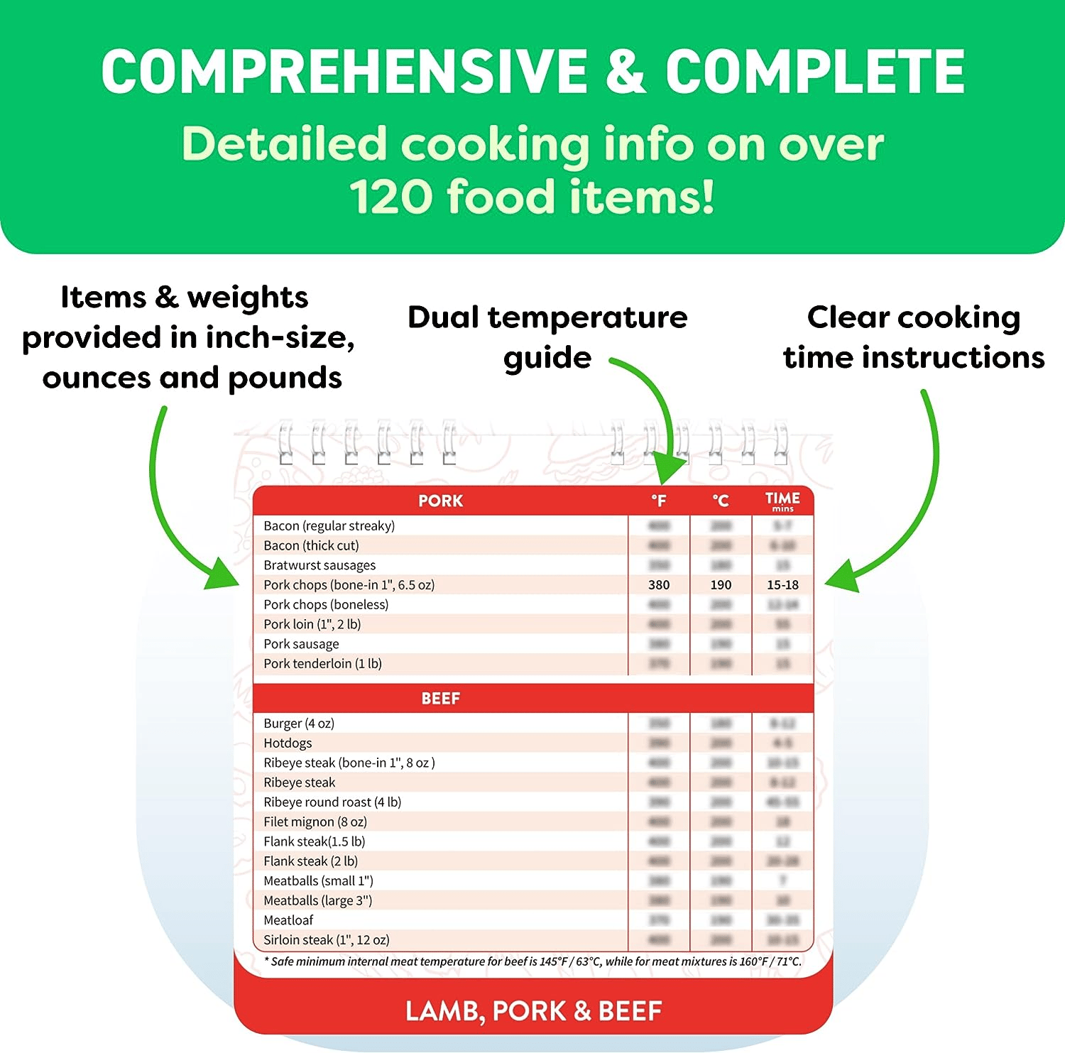 - Air fryer cooking times chart magnet, times and temp guide. Special sections include: tips & tricks, steak doneness prime rib cook temperature chart, safe minimum internal meat temps, vast Legumes & Vegetables section for vegans, and unique Bakery, Desserts & Snacks category.